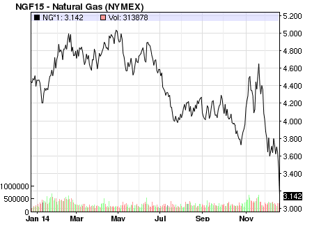 Idag föll naturgaspriset i USA till som lägst 3,14 USD, motsvarande ett fall på 9,9 %. För helåret har priset fallit med 26 %. Temperaturen har varit över det normala under månaden och väderprognoserna är att stora delar av landet ska ha det varmare än normalt även över årsskiftet. Detta har fått lagren att stiga och priset att gå ner.