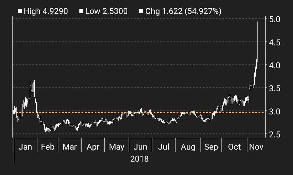 Oljepriset har fallit kraftigt den senaste tiden, naturgaspriset i USA går dock åt rakt motsatt håll och rusar i höjden. Frontmånadsterminen för naturgas vid Henry Hub rusade med som mest 20 % igår, den största prisrörelsen sedan 2009. Orsaken är att vädret plötsligt blivit kallare i USA. Denna morgon var det 0 grader celcius i Houston och t o m lätt snö mot norra delen av Woodlands. Samtidigt hade Permian temperaturer tydligt under fryspunkten.