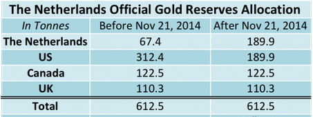 Nedan är en sammanställning över var Nederländerna har sitt guld lagrat. Som framgår var det bara guld i USA som man flyttade hem.