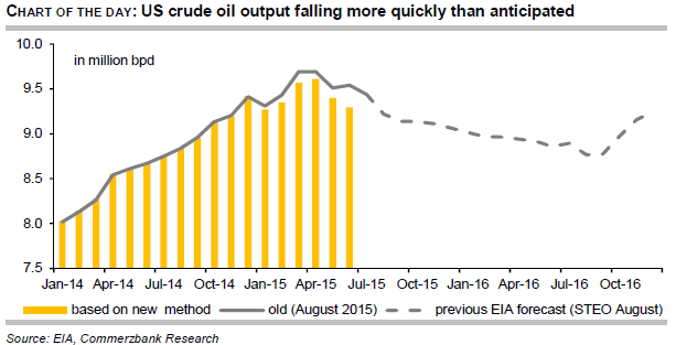 Oil prices made strong gains yesterday for the third consecutive day, Brent rising by a further 8% and WTI by 9%. Another sharp price increase did not seem on the cards at the start of trading yesterday, as oil prices were down by 3% for a time. It was not until the later course of US trading that prices rose significantly. Since last Thursday and up to and including yesterday, Brent has achieved a price gain of a good 25%, while WTI is up by more than 27%. In both cases these are their most pronounced three-day increases since August 1990, when Iraqi dictator Saddam Hussein invaded the neighbouring country of Kuwait, causing oil prices to soar. Following their massive gains in the last three days of trading, oil prices ended the month of August approx. 4% up, after having recorded losses of as much as 20% in the first three weeks. This price slide was not attributable to any change in the fundamental data since the end of July, however, but was due primarily to exaggerated concerns about China. As such, oil prices have merely returned to their end-of-July levels, which makes sense: after all, the oil demand figures from China have shown no signs of weakness whatsoever of late. Yesterday’s price surge was sparked by a report from the US Energy Information Administration (EIA), which showed that US crude oil production declined considerably more sharply than anticipated between April and June. According to the report, output in June totalled 9.3 million barrels per day, i.e. 250,000 barrels per day less than previously estimated. What is more, OPEC signalled in a report its willingness to talk to non-OPEC producers about measures aimed at shoring up prices.