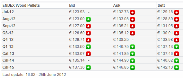 ENDEX, erbjuder börshandel i terminskontrakt på Wood Pellets CIF Rotterdam, med leverans. Handeln startade i november 2011 och är ännu mycket begränsad.