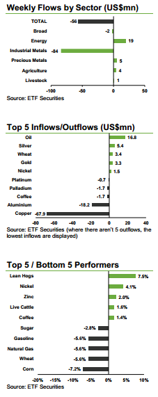 Profit taking drives US$18.1mn of outflows from ETFS Aluminium (ALUM). Aluminium price is up 19% since the beginning of the year as production cuts have substantially improved the fundamentals of a market which has been plagued by oversupply for years. At the same time, copper ETPs saw US$68mn of outflows last week. Copper has lagged other industrial metals like aluminium, nickel and zinc this year, on aggressive production expectations and fears of a slowdown in China. However, we believe fears of copper oversupply are overblown and that copper remains attractive at current price levels given the underlying fundamentals.