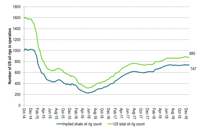 On Q2 above there have been a few US shale oil companies who have signalled that they will reduce activity/spending on drilling and completions in 2019 due to lower oil prices and we expect to see more of this. This has however not yet been reflected in a lower rig count or a lower level of well completions. During the previous “shale oil reset” the typical price inflection point was when the WTI 18 months forward crude contract moved above $45-47/bl. That was when the US shale oil rig count started to rise back in June 2016 however with a typical 6 week time lag versus the oil price. At the moment the WTI 18 mths contract trades at $48.8/bl and over the past 6 weeks it has averaged $52.2/bl. The comparable local Permian crude oil price does however trade some $5-6/bl lower with a proxy “Permian 18 mths contract” averaging $45/bl over the past 6 weeks. As such we could start to see weekly US oil rig count declines about now.