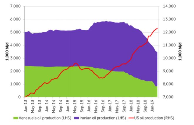 Ch1: Oil production Iran, Venezuela and the US in 1,000 bl/d. Make way for US oil. Who’s next? Iraq?