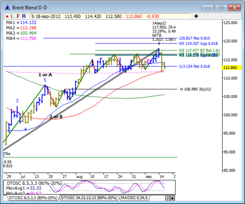 Olja har fortsatt att röra sig i sidled och vi kan fortsatt se att det blir en rörelse uppåt. Skulle oljan falla under $108.18 har vi istället sett för mycket svaghet och då kommer vi att se nivåer under $104.