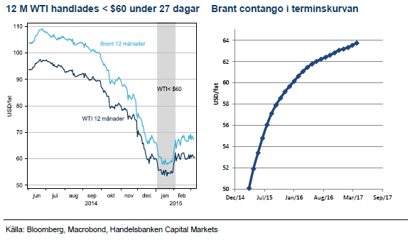 Drygt tre månader har gått sedan OPEC valde att inte stödja priserna på olja den 27:e november 2014. Saudiarabien vill inte länge subventionera de producenter som har högre produktionskostnad. Istället prioriterar landet att behålla sina marknadsandelar i en oljemarknad som inte längre växer som under de senaste åren. Priset på olja har gått från att ge incitament till ny produktion under en längre period med brist på olja i marknaden, till att nu, baseras på produktionskostnad för marginalproducenten när det råder överskott i marknaden. Den producenten hittar man i de sämre delarna av USA:s skifferoljefält. Prisraset på 60% i olja har triggat investerare att åter köpa tillbaka oljepositioner och priset har återhämtat sig till nivåer som ger incitament för nya investeringar i USA:s skifferfält. Av det skälet måste nästa prisrörelse vara nedåt och oljan måste stanna på en låg nivå under en längre tid för att balansera marknadsöverskottet.