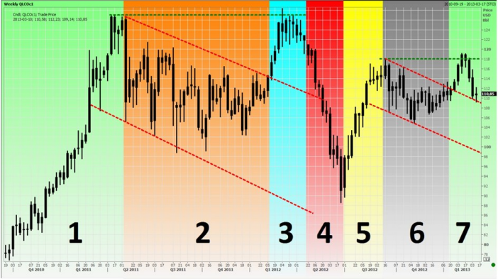 Att tyda en graf är såklart en subjektiv bedömning men de flesta är överrens om att mönstret från segment 5-7 är identiskt med segment 1-3 om än i mindre proportioner. Om mönstret upprepar sig står vi nu inför vad som skedde med priset i segment 4, d.v.s. en rätt stor nedsida. Ingen vet idag vad den utlösande faktorn skulle vara men vi har noterat att oljepriset och börserna gått åt skilda håll de två senaste veckorna vilket får oss att tro att oljan är väldigt sårbar för mer nedsida om börserna plötsligt skulle vända neråt. Börserna handlas nu upp på signaler om att åtminstone USA har börjat skapa tillväxt men med bättre konjunktur kommer högre räntor och generellt svagare råvarupriser.