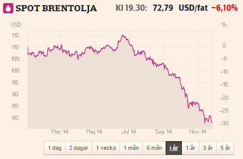 Priset på brent-olja efter OPEC-mötetDe flesta OPEC-representanterna kom ut från mötet och såg nöjda ut, förutom Venezuelas utrikesminister Rafael Ramirez som tydligen var röd i ansiktet av ilska. Vilket kanske inte är så konstigt för landet är redan så nära en konkurs det går att komma och med dagens oljeprisnivåer kommer smällen att bli brutal.