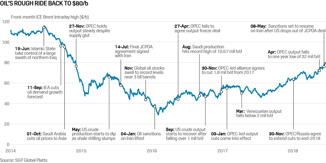 Oljepriset är tillbaka på 80 USD per fat, dvs där priset var i slutet av 2014, men det har varit en allt annat än lugn resa. Nedan är en intressant grafik från Platts som visar oljans prisutveckling och vilka händelser som har inträffat på vägen.