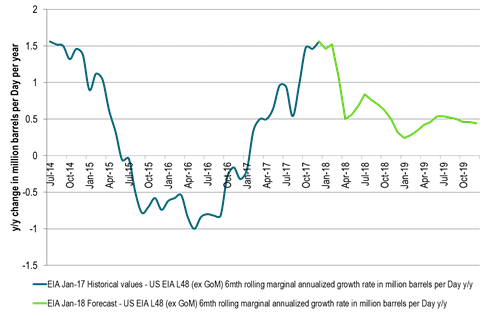 Chart 3: US 6mths rolling marginal annualized growth in US L48 (ex GoM) in m bl/d (EIA)