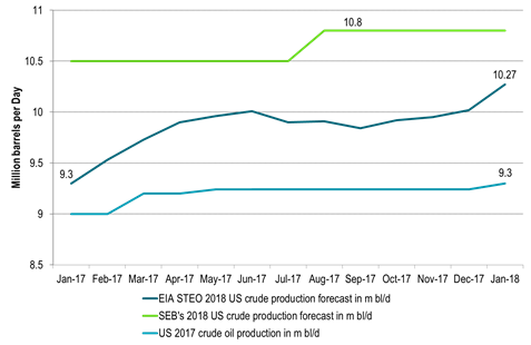The US EIA yesterday revised US crude oil production for 2018 up by 250 k bl/d to 10.27 m bl/d. That was the fourth revision higher in four months. We still think it is too low with more revisions higher to come and we think that everyone are probably able to see this with just a half eye open.