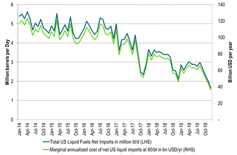 Chart 2: US net hydro carbon liquids imports (EIA) and the implied trade balance impact in billion USD at an oil price of $60/bl (SEB)