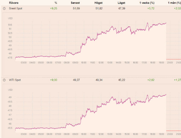 Det kom en riktigt stor nyhet på oljemarknaden idag, nämligen att OPEC har kommit överens om produktionsbegränsningar, vilket är första gången på 8 år. Överenskommelsen innehåller dessutom individuella kvoter, vilket är betydligt kraftfullare än att bara sätta en total volym. Även Ryssland som inte är med i OPEC lovar att sänka sin produktion. Oljepriset har rusat i höjden under dagen, både WTI och Brent är upp över 9 % i skrivande stund.