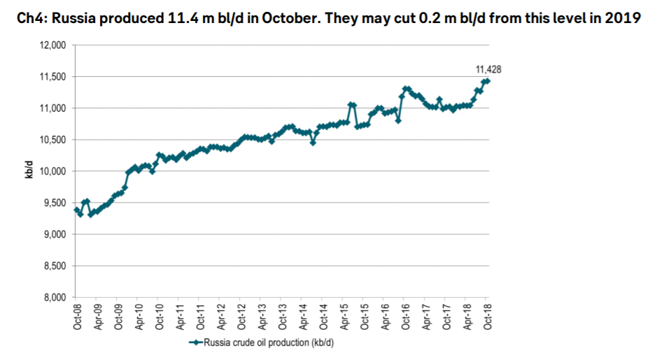 Ch4: Russia produced 11.4 m bl/d in October. They may cut 0.2 m bl/d from this level in 2019