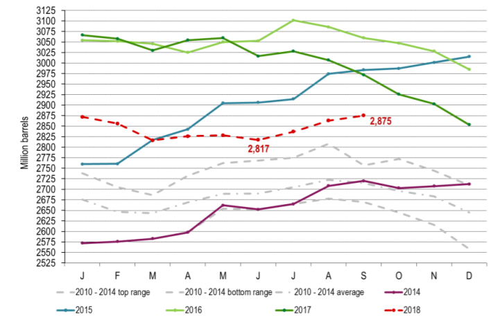 Ch1: OECD commercial inventories have increased 58 m bl from June to September. Inventories normally increase 25 m bl this period of year. Thus adjusting for seasonality the inventories rose only 33 m bl over these three months