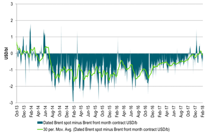 Chart 2: Dated Brent crude has shifted to a discount to Brent 1mth rather than a premium