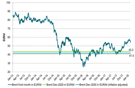 Chart 1: Brent crude 1mth contract in Euro/bl and current price of Brent Dec-2020 in Euro/bl and Real Euro/bl (inflation adjusted)