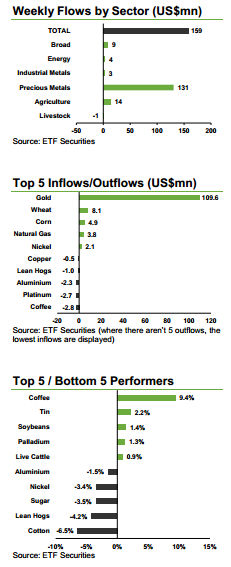Investors took profit on ETFS Daily Leveraged Coffee (LCFE), redeeming US$4.2mn, after prices rallied 9.4% in a week. Reports of colder and rainier weather in Brazil, which produces 45% of the world’s Arabica coffee crop led to strong price gains. Excess rain has the potential to stall the harvest which is underway and the cold could lead to frost damage. However the forecast is for drier and warmer weather now, prompting the profit taking.