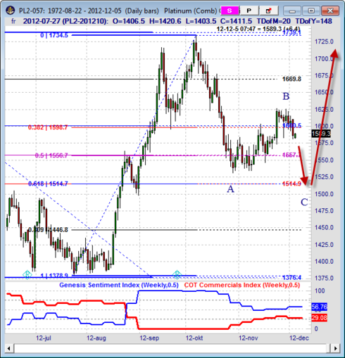Säsongsmönstret för Platina föreslår att vi har sett en topp och att det inte kommer en botten förrän runt den 16-20 december. Men det är då en större botten med en uppgång till minst den 17 januari men troligast den 14-18 februari med den 23 februari som ett alternativ.
