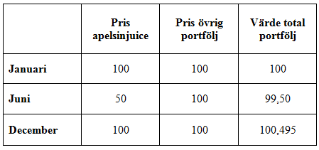 Trots att priset på apelsinjuice sett över hela året är oförändrat och trots att dess vikt i indexet är en futtig procent bidrar den med inte mindre än 0,495% till totalavkastningen i exemplet. I figur 1 visas totalportföljens värde som funktion av apelsinjuicens värde i juni förutsatt att den slutar året oförändrad och övriga portföljen står stilla. Notera att under dessa förutsättningar kan bidraget aldrig bli negativt!