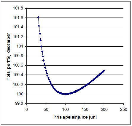 Figur 1. Värde på total portfölj i december som funktion av pris på apelsinjuice i juni.