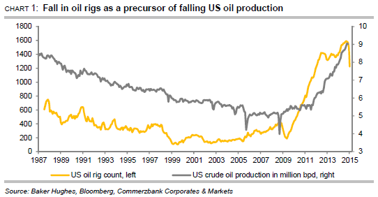 Oil prices soared by 8% on the last trading day of January and continued their high-altitude flight in the first two trading days of the new month. The price of Brent rose to $59 a barrel at its peak, WTI to $54 a barrel. As a result, this year’s price losses have been reversed completely. The price rally of almost 18% within three trading days was the sharpest rise since the beginning of 2009, when the price surged by 25% within four trading days. The recent price spike was probably triggered by data from oil service company Baker Hughes on drilling activity in the US. The number of active oil rigs shrank by 94 last week, the biggest weekly drop since records were first kept in 1987. Since the record high of last October, the oil rig count has fallen almost continuously by a total of 24% to a 3-year low, whereby the slide accelerated in January (chart 1). Two thirds of last week’s decline was attributed to horizontal rigs which are being used in extracting shale oil. OPEC’s strategy of forcing shale oil supplies from the market via low prices appears to be working more quickly than many had expected. Market players who had bet on a further price slump should have subsequently closed their short positions, thereby strengthening the price rally. Others are likely to have jumped onto the bandwagon once the psychologically important mark of 50 USD had been overcome. The foundation for a steady price recovery in the second half of the year has thus been laid by the expected decrease of US oil production. In the short term, however, the price increase is exaggerated in our view, as there is still a considerable oversupply. This is borne out by Reuters and Bloomberg surveys which show OPEC oil output rising in January. In both surveys it is above the official OPEC production target of 30 million barrels a day, in the case of Bloomberg it is well over, at almost 31 million barrels a day. On the other hand, the demand for OPEC oil in the current year is estimated at only 29.2 million barrels a day. For the first half of the year, it is much lower still. We therefore do not view the last price leap as a trend reversal yet and still see the risk of another price fall. This was also the case at the beginning of 2009 when the aforesaid surge by 25% at the onset of the year was followed by another slide in mid-February before a sustained price recovery started in March. That said, the odds are greater now that the oil price hit its low point in mid-January at $45. Market sentiment has brightened significantly recently. Sharply rising US stocks and a refinery strike in the US have no longer been able to keep oil prices under pressure lately.