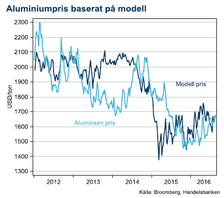 Lättviktsmetallen handlas omkring årshögsta, mestadels beroende på en svagare dollar och starkare oljepris. Modellen vi använder för aluminiumpriset stämmer just nu perfekt med rörelserna i USD och olja. Med vår tror på ett oljepris ner mot USD 40 så bör aluminium falla tillbaka till USD 1500-1550.