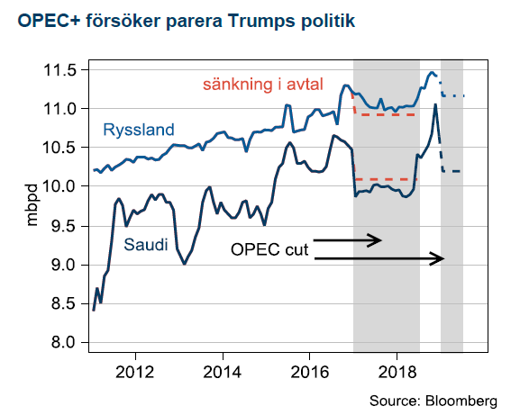 Efter tullar på stål och aluminium införde Trump sanktioner mot Oleg Deripaska, majoritetsägare i Ryska aluminiumproducenten Rusall, vilket drev upp aluminiumpriset med nästan 30 procent i april. I maj meddelade Trump att sanktioner mot Irans oljeexport skulle införas i november. Det fick oljepriset att stiga med 20 procent fram till oktober då oron kulminerade med mordet på Khashoggi. Ryssland och Saudiarabien såg en möjlighet att utnyttja sanktionerna mot Iran som en gratis exit från avtalet om att sänka produktionen. De båda jättarna hade precis ökat produktionen när Trump bytte fot igen – det blev inga sanktioner mot Iran och oljan avslutade året med ett fall på 38 procent från toppen i oktober. USA:s utrikespolitik skapade därmed den mest volatila avslutningen på oljeåret sedan finanskrisen.
