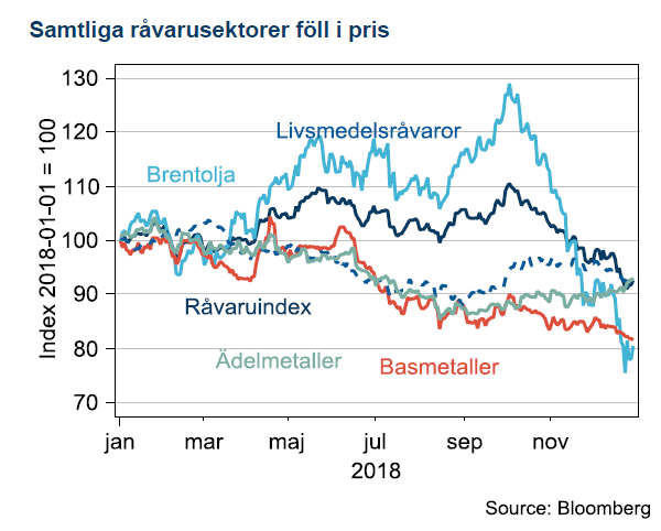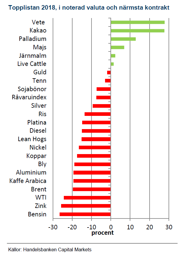 Den globala högkonjunkturen ser nu ut att svalna, och med lägre tillväxtförväntningar ser vi breda nedgångar i råvarupriserna efter några starka år. Under 2017 handlades råvaror på de högsta nivåerna på tre år. 2018 års topplista påminner mycket om 2017 års lista men läst upp och ned. Industriråvarorna har flyttat från toppen till bottennoteringarna när investerarna prisat in en svagare tillväxt under 2019. Handelsbankens breda råvaruindex slutade 7,4 procent ner under 2018.