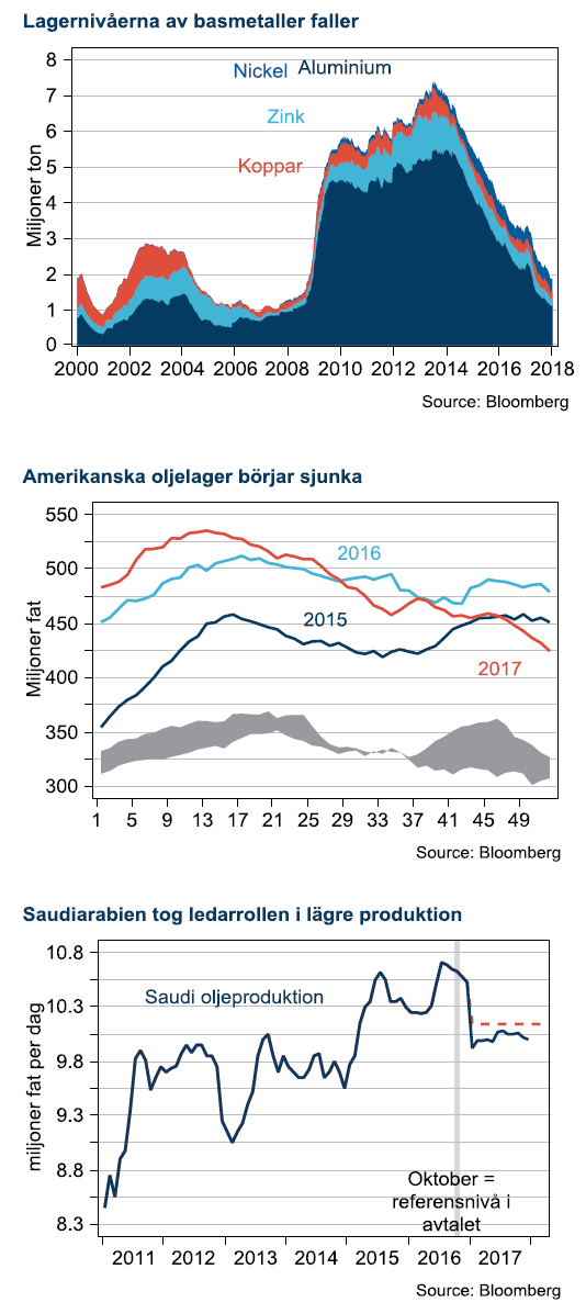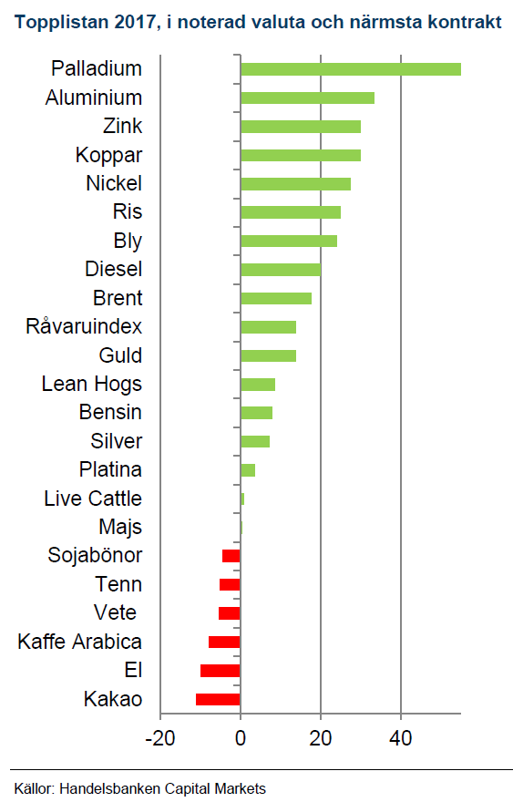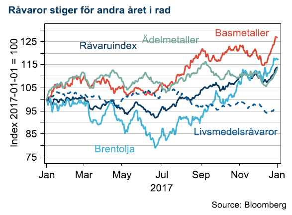 Handelsbankens breda råvaruindex slutade 13,2% högre än 2016. 2017 års uppgång är visserligen blek mot 2016 års uppgång på 23%, men vittnar om att den globala konjunkturcykeln är inne i en mogen fas där det brukar bli brist på råvaror. För en råvaruinvesterare har dock den starkare kronan suddat ut mycket av avkastningen. Råvaruindex i SEK har enbart gett 2,8% avkastning, vilket kan jämföras med kronförsvagningen under 2016 som ökade vinsten till 34% i SEK det året.