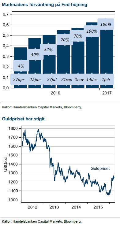 Vi har tidigare argumenterat för att Feds supermjuka penningpolitik var den främsta drivkraften till guldprisuppgången efter finanskrisen. Guld föll också kraftigt när Fed började med ”tapering”. Efter att Fed startat höjningscykeln i december har mycket utvecklats på ett ogynnsamt vis för Amerikanska centralbanken. Makrodata har visserligen förbättrats och finasiella marknader har i stort återhämtat sig sedan decemberhöjningen. Osäkerheten i marknaden består dock och det är långt kvar till räntemarknaden åter prisar höjningar från Fed likt vid decembermötet. Nu finns endast en höjning kvar i år enligt räntemarknadens prissättning.