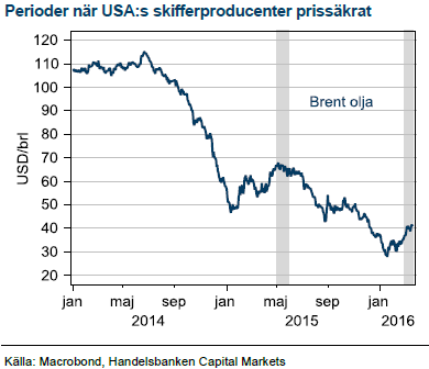USA:s skifferindustri har visat sig priskänslig, men på allt lägre nivåer. Förra året var skifferindustrin framgångsrik i att refinansiera bolagen och sälja olja på termin under prisstudsen till USD 68 i maj. Den strategin förlängde produktionen när priserna sedan föll efter Iranavtalet i juli. I år ser vi att producenterna åter säljer olja på termin för 2017 som inklusive contango ger USD 45 efter senaste studsen till USD 40 för närmsta terminen. Historien ser alltså ut att upprepa sig och utan OPEC-sänkning tror vi att oljestudsen har gått för långt.
