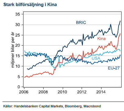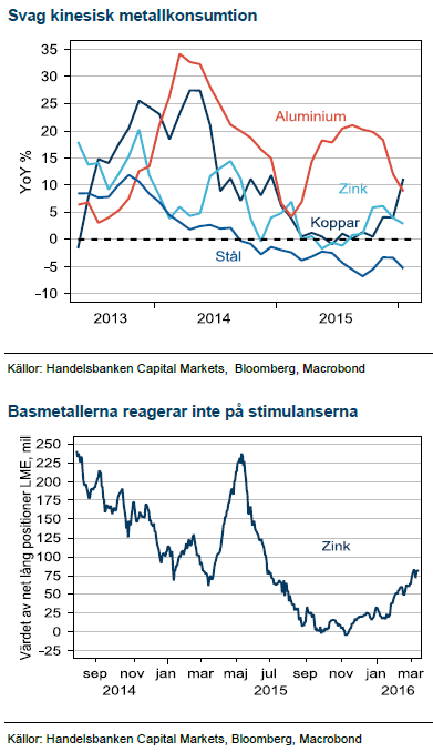 Trots stark fastighetsmarknad i Kina syns ännu inga tecken på att byggandet ska öka efter att ha minskat med omkring 15 % per år de senaste två åren. Vi tror fortfarande att stålkonsumtionen är en ledande indikator för basmetallkonsumtionen i Kina och den fortsätter att falla. Det enda ljuset i mörkret är bilproduktionen, som efter statliga subventioner sedan oktober går urstarkt. Globalt står nu bilmarknaden för 7-8% av efterfrågan på koppar.