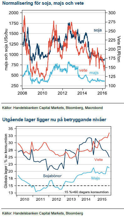 Majs har varit extra hårt ansatt då grödan är tätare kopplad till energimarknaden genom användningen i etanolindustrin och därmed det fallande oljepriset. Majspriserna har parkerat på låga nivåer, ett typsikt tecken för en råvara som ligger i överskott och handlas kring produktionskostanden. Även majsexporten från USA går trögt, 18 % under fjolårets nivå. Något stöd har dock majs fått från senaste tidens svagare USD samt något långsammare start på skörden i Argentina. Det finns inget större skäl till tro på en snar vändning upp, men vi bedömer nedsidan som begränsad.