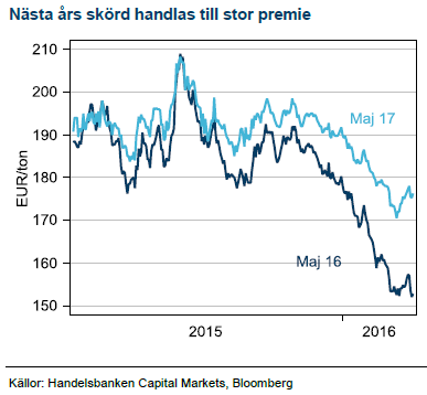 Prisfallet är redan större än vi förväntade oss för tre månader sedan. Trots det ser vi inget, förutom väderproblem i något av de större odlingsområdena som kan vända pristrenden. Terminer med längre löptid handlas till en stor premie, främst en riskpremie för eventuellt sämre skörd. Normalt faller denna riskpremie ur successivt fram till skörd. Vi tror på ett liknande scenario i år och illustrerar med grafen till höger där spreaden mellan gammal (maj 2016) och kommande (maj 2017) skörd syns. Vi trodde tidigare på priser kring 160 EUR/ton vid årets skörd men sänker nu denna till 140, lägsta på många år och rimligen en prövning som kan komma att balansera produktionen för nästa år och därmed dämpa lageruppbyggnaden.