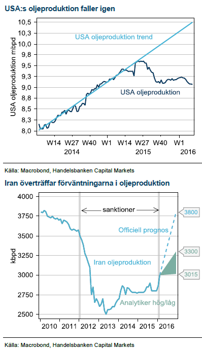 Efter att spenderat det mesta av januari och februari omkring 30-strecket studsade oljan plötsligt upp i mitten av mars. Utbudsstörningar i Irak och Nigeria tillsammans med diskussionerna mellan OPEC och Ryssland om att frysa produktionen gav priset stöd samtidigt som USA:s skifferolja minskade produktionen i sviterna av de låga priserna. Upptakten till OPEC:s sänkning av produktionen på 90-talet var väldigt lik den nuvarande när oljeministrarna reser mellan oljestäderna påhejade av spekulation i media och marknaden.