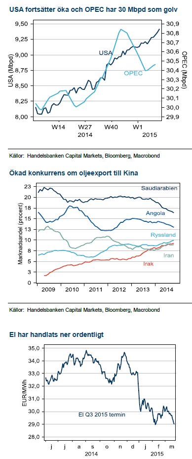 Februari månads kraftiga uppgång på 25% i oljepriset fick ett abrupt slut i mars när marknadens fokus återvände till underliggande fundamenta som i våra ögon inte förbättrats trots att snart nio månader passerat sedan oljeraset startade i juli 2014. Olja är inte bara centralt för världsekonomin, det är också den råvara med störst inflytande på produktionskostnaden för andra råvaror. Det är därför svårt att se stora prisuppgångar i metaller eller elpriser när de lägre oljepriserna fortsätter att äta sig in i produktionskostnaden för råvaror.