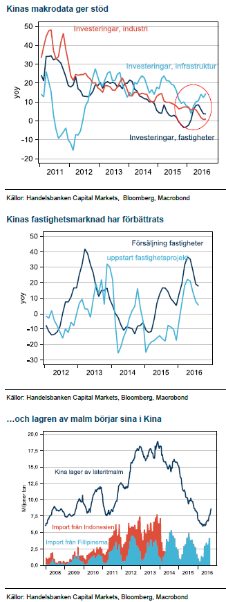 Vår tro på högre zink och nickelpriser har besannats, och av rätt skäl. Brist i marknadsbalansen efter stängda gruvor för zink, då flera stora är utbrutna och för nickel, efter miljöutvärderingen på Filippinerna. Störst effekt i marknaden räknar vi med först under 2017 när höga lagernivåer betats av. Vi fortsätter därför att tro på stigande priser trots uppgångar på knappa 50% för zink och 20% för nickel det här året.