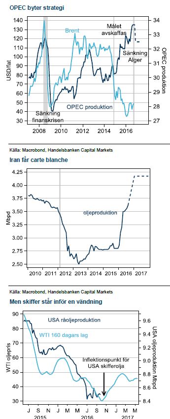 För 2017 är det mycket som ska bevisas. Historiskt har OPEC haft mycket svårt att solidariskt dela på minskad produktion. Den här gången lär dessutom Saudi vara extremt krävande. Samtidigt hotar ökad aktivitet i skifferindustrin. Därifrån ser vi ny press på oljan under kommande sex månader.