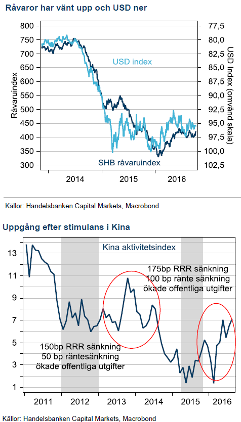 Basmetallerna som grupp har nu stigit tre kvartal på raken. Det har inte hänt sedan återhämtningen efter finanskrisen i slutet av 2010 till början av 2011. Kinas återhämtning det här året kommer från riktade stimulanser mot fastighetsmarknaden och infrastruktur under 2015. En gammal väl beprövad metod som konsumerar mycket industriella metaller. Vi trodde tidigare att cykeln skulle börja mattas i slutet av året men data fortsätter komma in på bra nivåer och vi tror därför på fortsatt stigande priser för basmetaller.