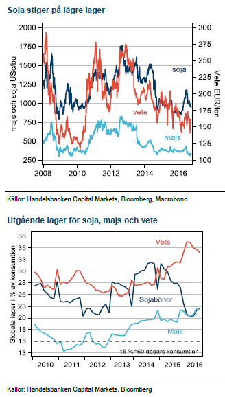 Om nästa års skörd ökar på nuvarande lager finns det fortfarande viss nedsida i vetepriser, låga priser är alltså ingen garanti för att undvika ännu lägre priser. Vi är dock i tron om att vetepriser nått eller åtminstone är väldigt nära en botten nu. Det är alltså främst i USA som lagernivån är riktigt hög och med rådande låga priser väntas de amerikanska lantbrukarna även i år minska vetearealen till förmån för andra grödor. Det begränsar möjligheten för fortsatt lageruppbyggnad i USA vilket i kombination med mer måttliga lager för flera övriga exportländer och kvalitetsproblem bör ge ett stöd åt vetepriser framgent.