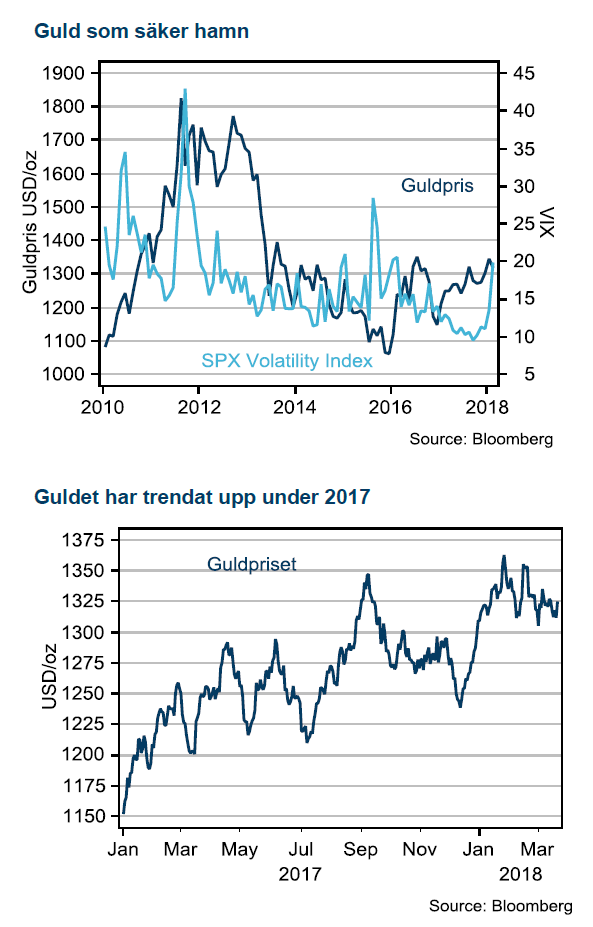 Guldpriset har stigit 5,7% sedan december och fått en mycket tydligare koppling till risk och oro. Största hickan på senare år kom 2016 under Brexitomröstningen. Vid större händelser har guld återfått sin glans men faller tillbaka från topparna så länge börsen fortsätter stiga. Nordkoreas vapenskrammel och annan politisk risk såsom valet i Italien och Trumps handelskrig har varit starka drivkrafter för guld. Vi ser en tydlig trend där guld blir allt mer intressant i takt med att bågen späns i värderingar i andra sektorer under 2017. Under 2018 har början på året präglats av ökad volatilitet på samtliga tillgångsmarknader.