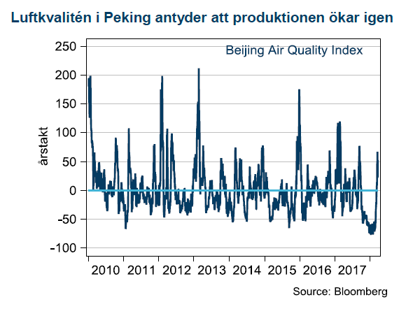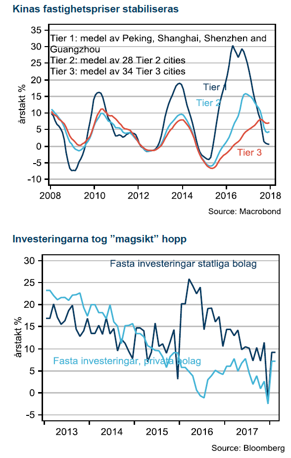 Förväntningarna på Kina för 2018 har varit lågt ställda, hittills har dock data överraskat positivt. Det fanns en osäkerhet kring tillväxtmålet då Xi lagt mindre fokus på det under senare tid. Tillväxtmålet ligger dock kvar på ”omkring 6,5” att jämföra med ”omkring 6,5% eller högre om möjligt” som gällde 2017. Tillväxtmålets betydelse har ändå spelats ner men det faktum att det finns kvar gör att Kina kommer fortsätta styra ekonomin mot målet framöver, antagligen fram till 2020.