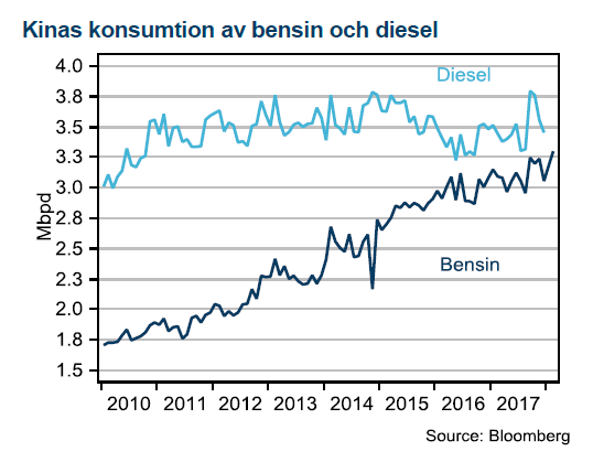 Så här långt har inte tillväxten i efterfrågan justerats i någon större utsträckning. Dieselefterfrågan i Kina har fallit i takt med Xi Jinpings miljökampanj och bensinefterfrågan stiger inte längre lika fort. Vi ser en sannolikhet att nedrevideringar av efterfrågan kan bli drivkraften till nästa större prisrörelse för oljepriset.