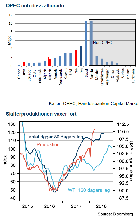 Amerikanska skifferproducenter har åter överraskat marknaden och både OPEC och IEA har fått revidera upp prognoserna för USAs oljeproduktion det här året. OPEC har inte gjort mindre än fem upprevideringar på lika många månader. Vi hade höga estimat på USA och förvånas över att revideringen inte sänkt priset mer, ca 5-6 USD. Vi hade räknat med USD 10.