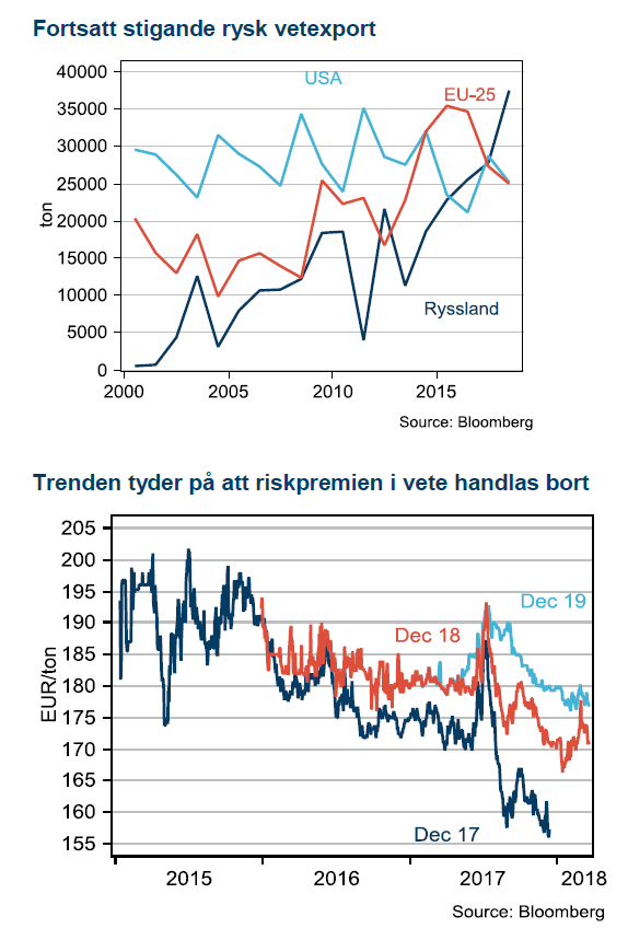 Återigen har en väderrelaterad riskpremie byggts upp för att sedan försvinna lika snabbt som den kom, vi såg det nu och vi såg det än tydligare månadsskiftet juli/augusti förra året. Dessa situationer kommer dyka upp igen och visar sig ofta vara bra säljtillfällen. Det är lätt att konstatera i efterhand att marknaden ofta överreagerar och det gamla talessättet ”buy the rumor sell the fact” ter sig ganska passande här. Där fakta just nu är att det finns gott om vete att tillgå i världen och mycket ska till för att ändra på det. Fakta är också att redan nu har ryska inflytelserika analytiker en prognos för inhemsk veteskörd år 2018 överstigande den de för ett år sedan hade för rekordskörden år 2017.