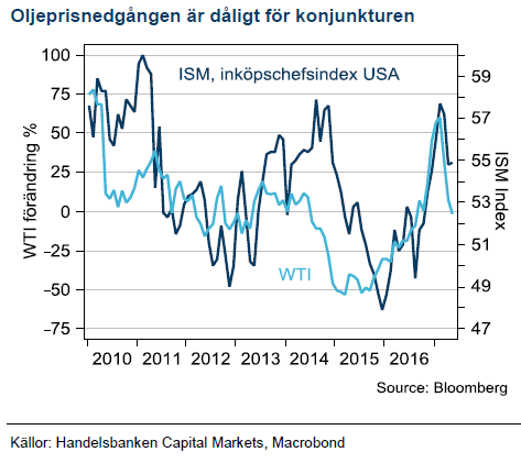 Optimismen efter det amerikanska valet i november förra året har allmänt betraktats som en ”Trump trade”. Initialt visade USA bättre ekonomisk statistik men det var i hög grad en effekt av stigande oljepris, uppgång i Kina och QE, snarare än Trump. De här tre drivkrafterna har tillsammans haft kraft att lyfta ekonomin och tillväxtförväntningarna, men effekten har nu avtagit och Trump ser ut att få svårt att kompensera för det. USA:s konjunktur har ett ganska starkt samband med förändringen i oljepriset sedan skifferboomen 2010. Årets nedgång i oljepriset kommer därmed tynga USA-data under andra halvåret.