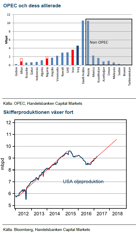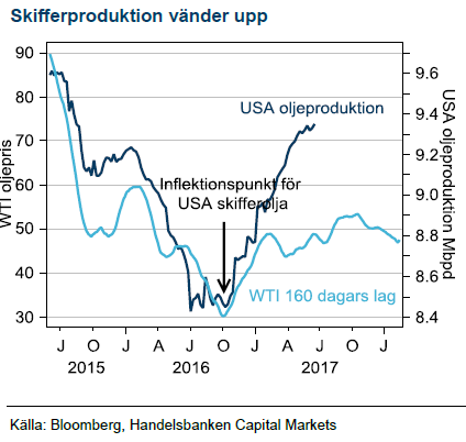 Skifferoljan är tillbaka i samma tillväxttakt som uppvisades omkring USD 100/fat. Den snabba tillväxten på dagens priser gör OPEC:s strategi omöjlig i längden. OPEC kommer tvingas återgå till jakten på marknadsandelar och priset kommer komma under press. Vi behåller USD 40/fat som prognos vid slutet av 2017.