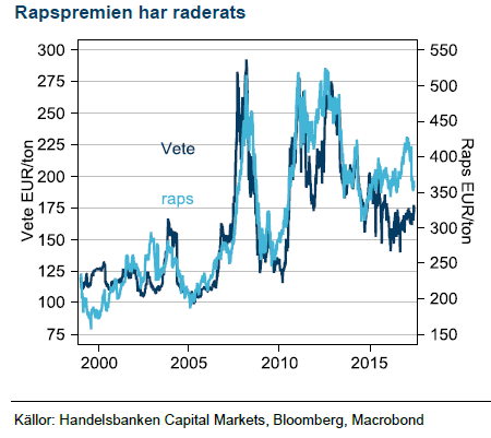 För tre månader sedan skrev vi om den ovanligt höga premien i raps jämfört med vete. Högre oljepris och vissa väderproblem i Europa och Ukraina fick rapspriset att stiga oväntat under förra odlingsåret. VI hade tre argument för varför premien skulle falla:. främsta skälet var lägre oljepris, andra skälet att USA och Sydamerika sannolikt kommer leverera en rekordskörd av soja och tredje skälet att en normal skörd i Europa kommer sänka rapspriset. Så här långt har första argumentet besannats och haft en relativt stor inverkan på priset. Viss nedsida för raps finns dock kvar när sojaskörden och rapsskörden kommer.