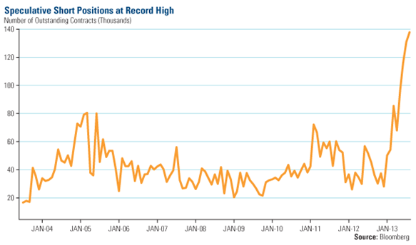 Titta till exempel på hur pessimistisk omvärlden är till guld. Det går att se, via de korta positioner som publiceras löpande, hur de negativa spekulanterna har attackerat guldet. Det går att se hur dessa har ökat kraftigt sedan början av året och vid halvårsskiftet uppgick dessa till ofattbara 140 000 kontrakt, vilket framgår av diagrammet nedan.